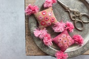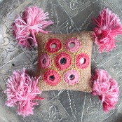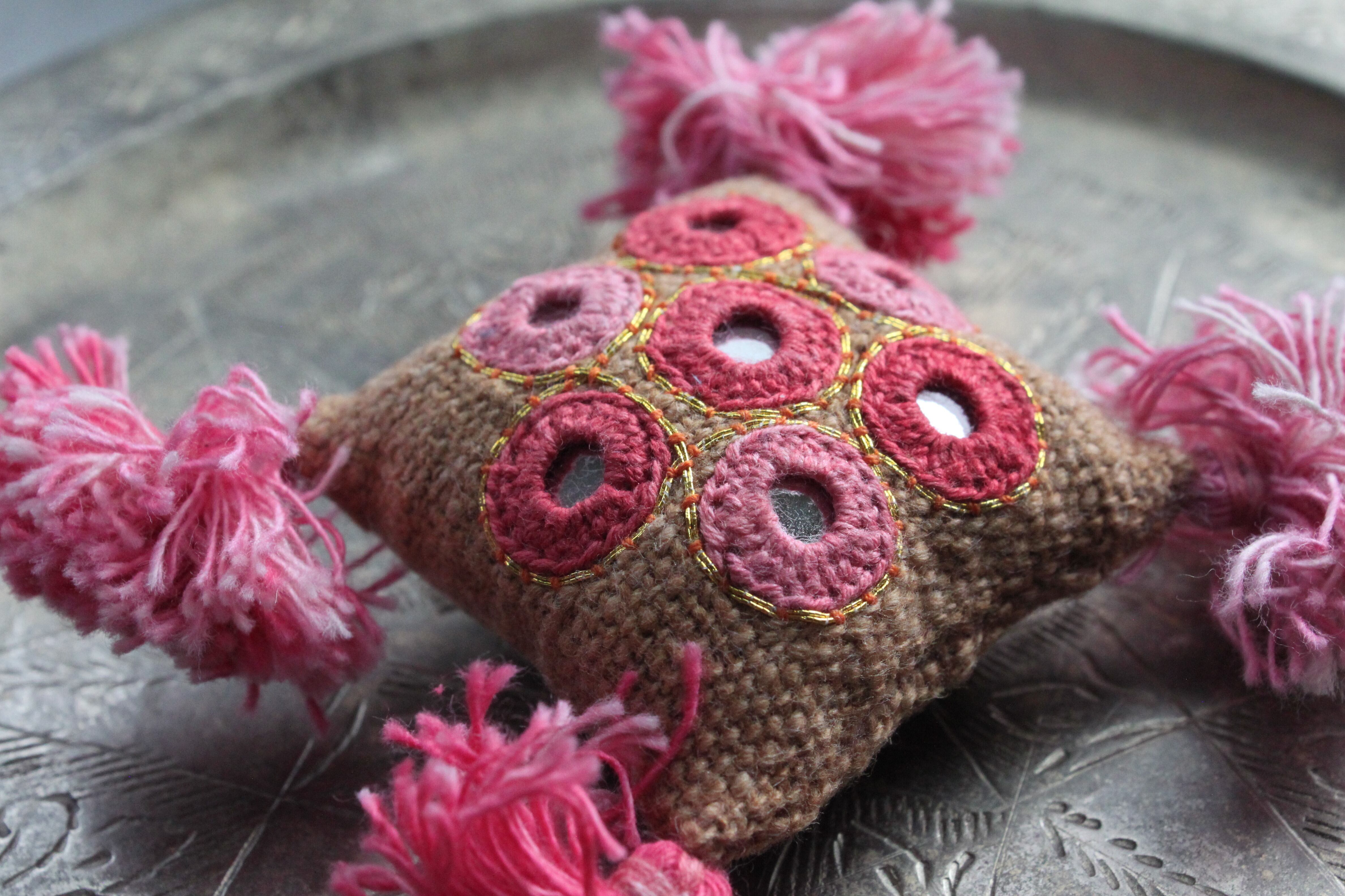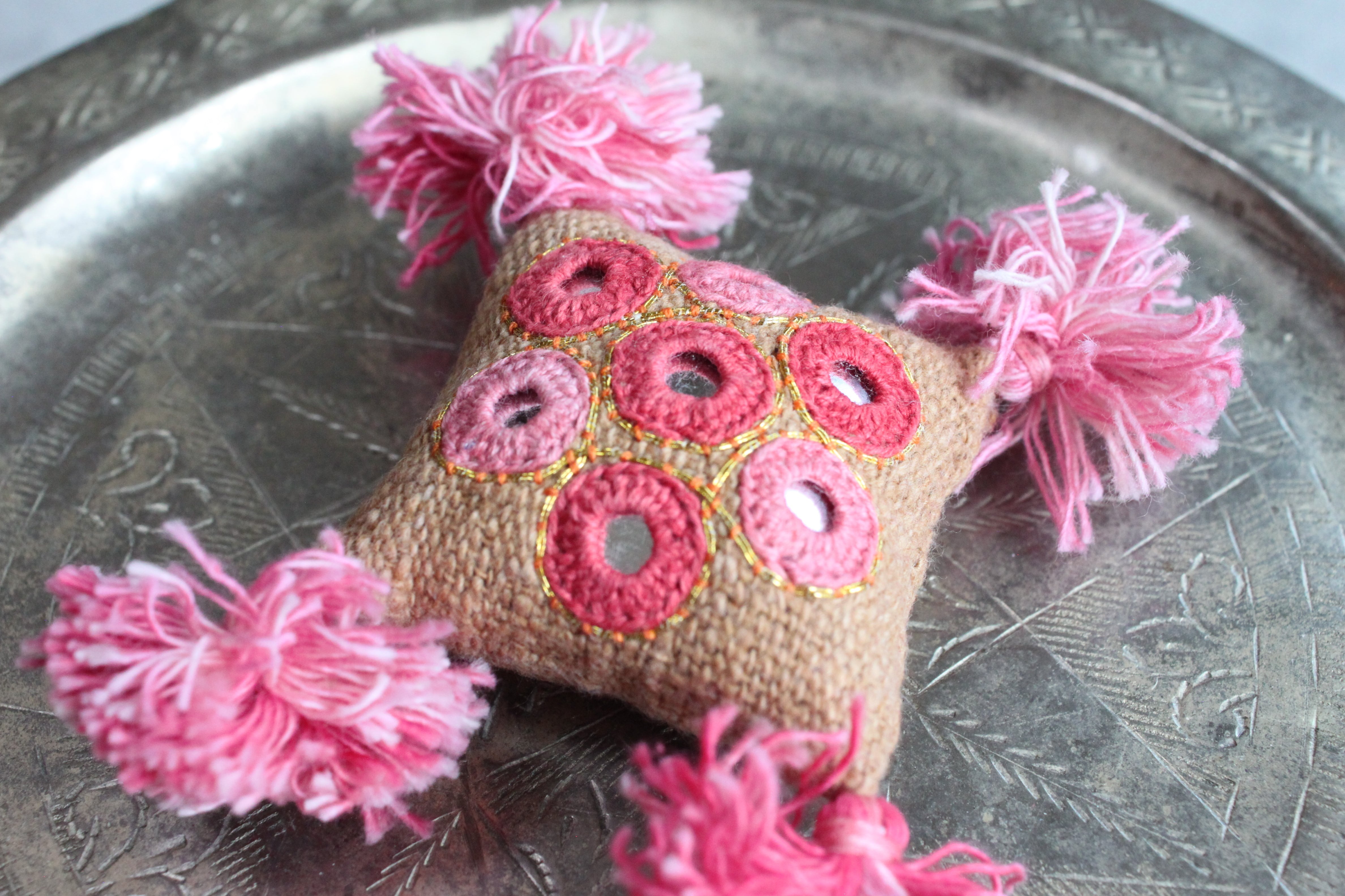 ラオスの手織布にミラー刺繍を施したピンクッションです。