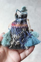 タイの民族衣装の生地をベースにインドの刺繍生地や藍染のフリンジを装飾して作った、手のひらサイズの巾着袋。