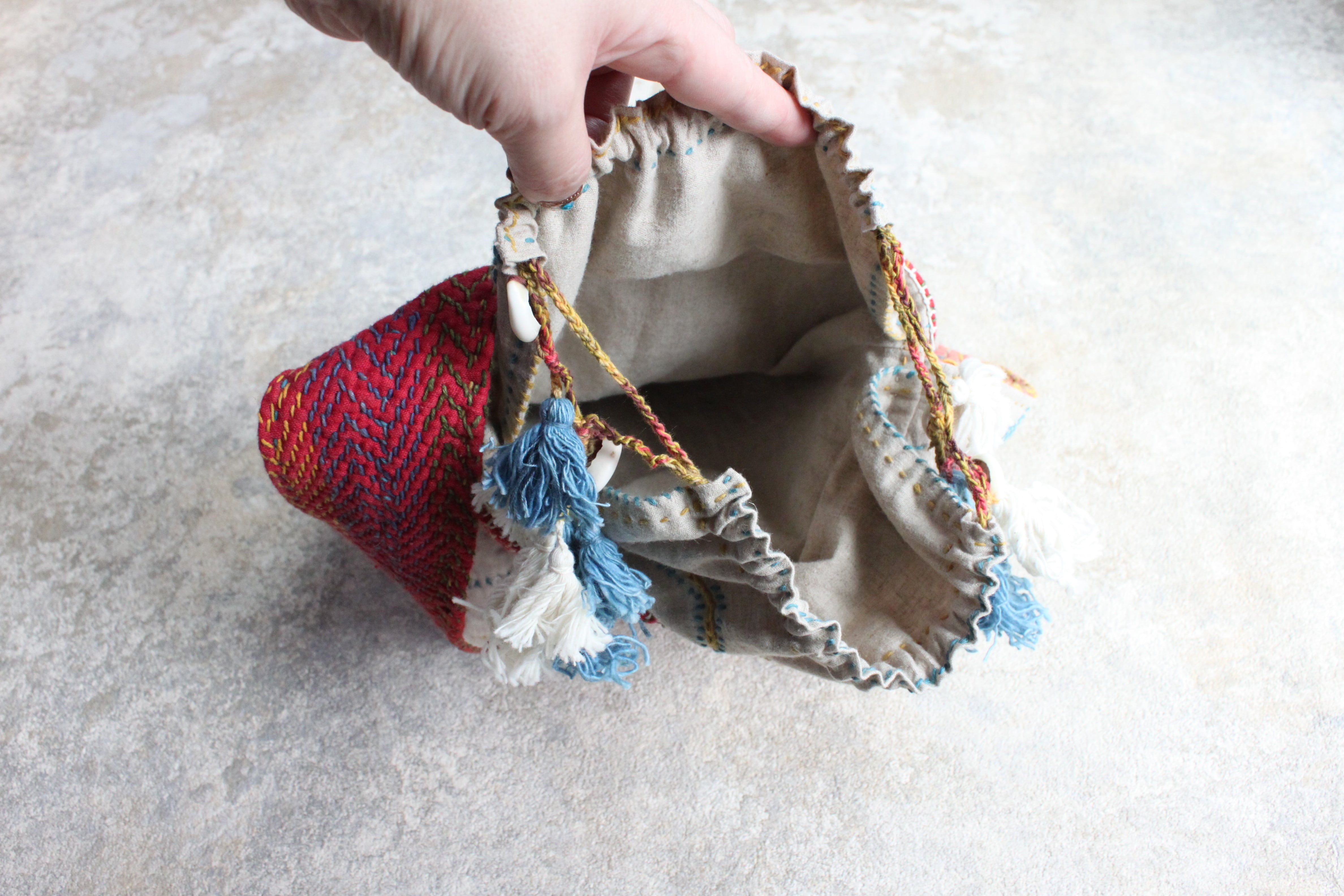 インド バンジャラ族の刺繍生地で作った巾着バッグです。