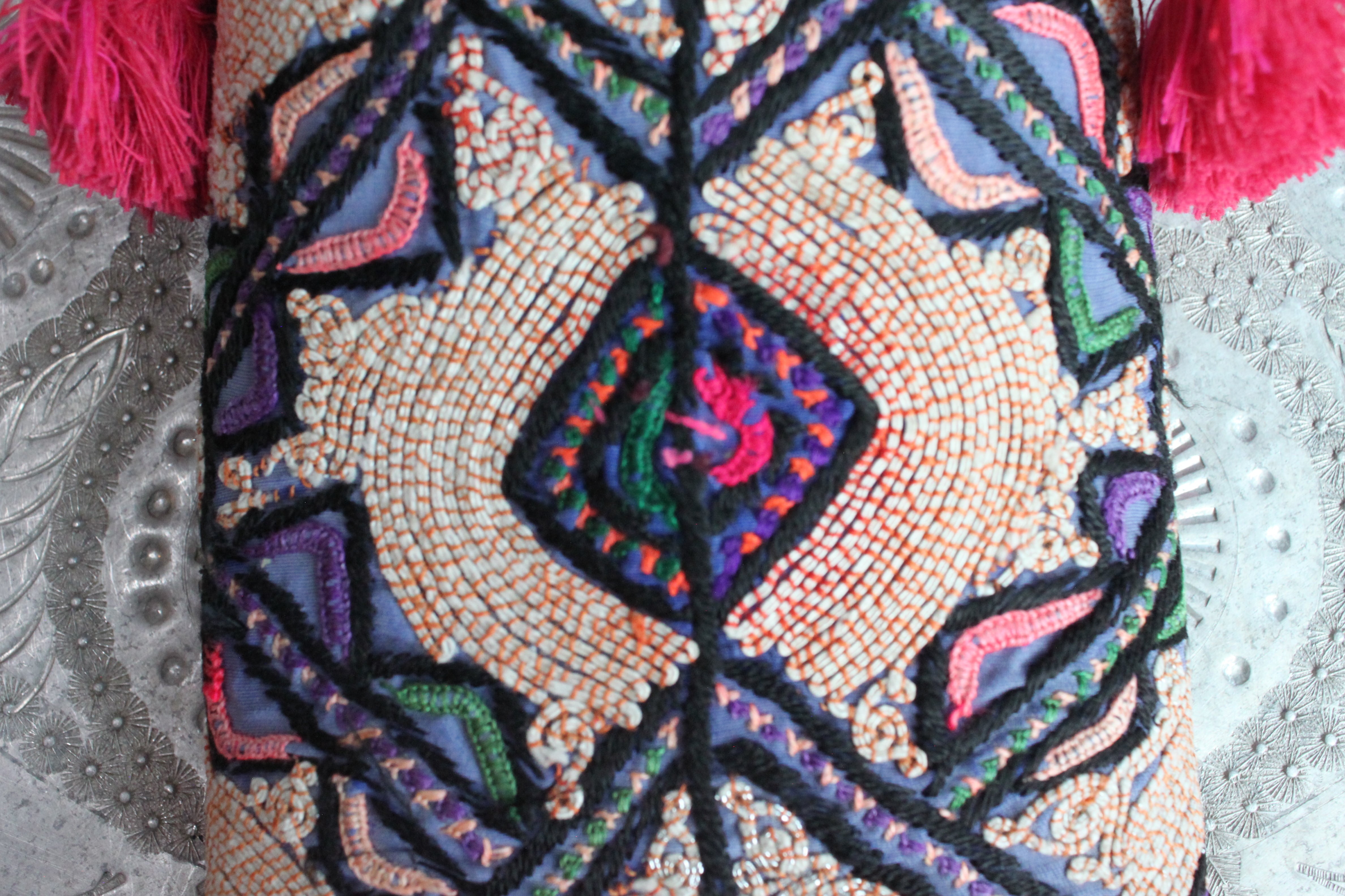 青色系のベースに散りばめられたミラー刺繍、カラフルでエキゾチックな刺繍のデザインが素敵な一点物です。