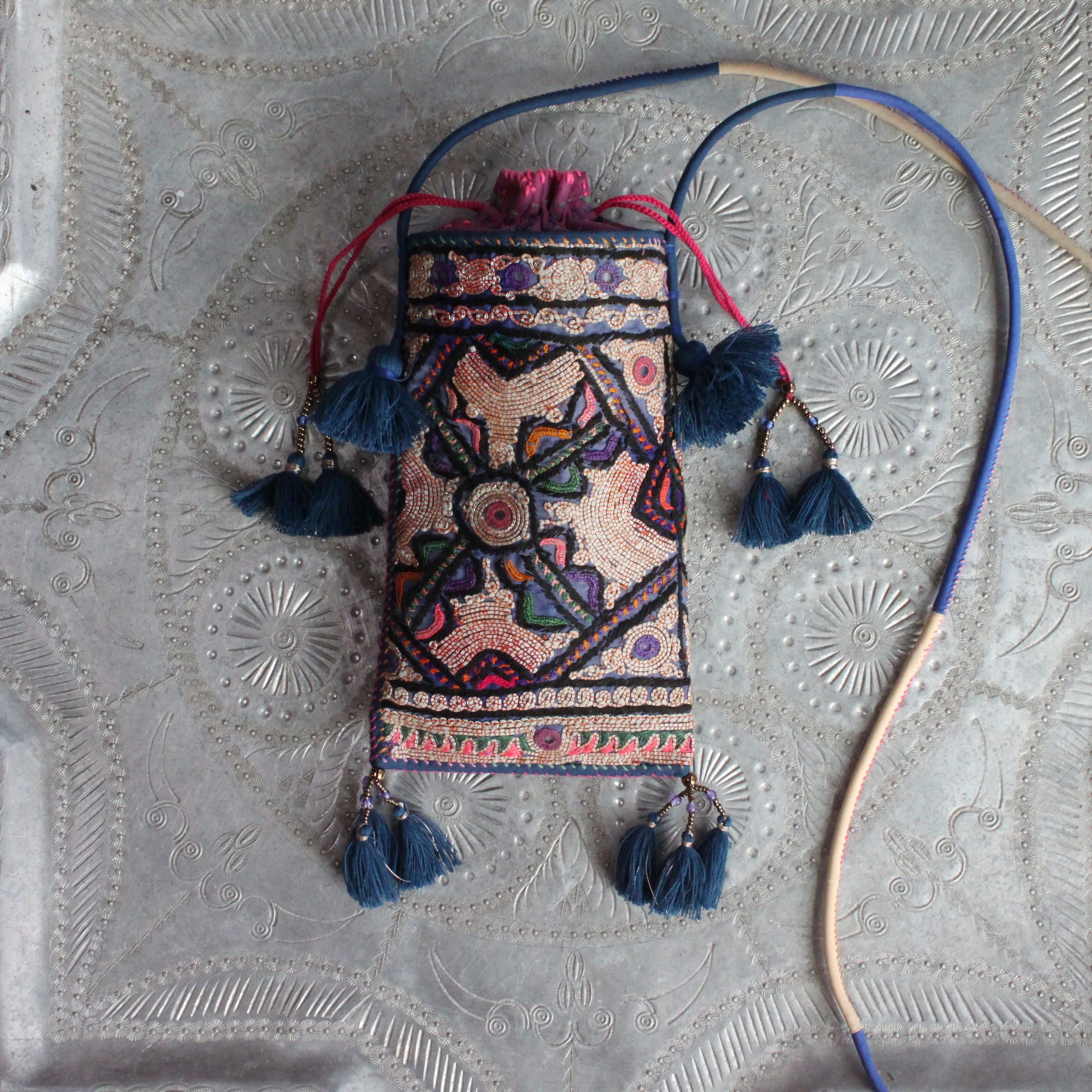 青系のベースに散りばめられたミラー刺繍、カラフルでエキゾチックな刺繍デザインが素敵な一点物です。