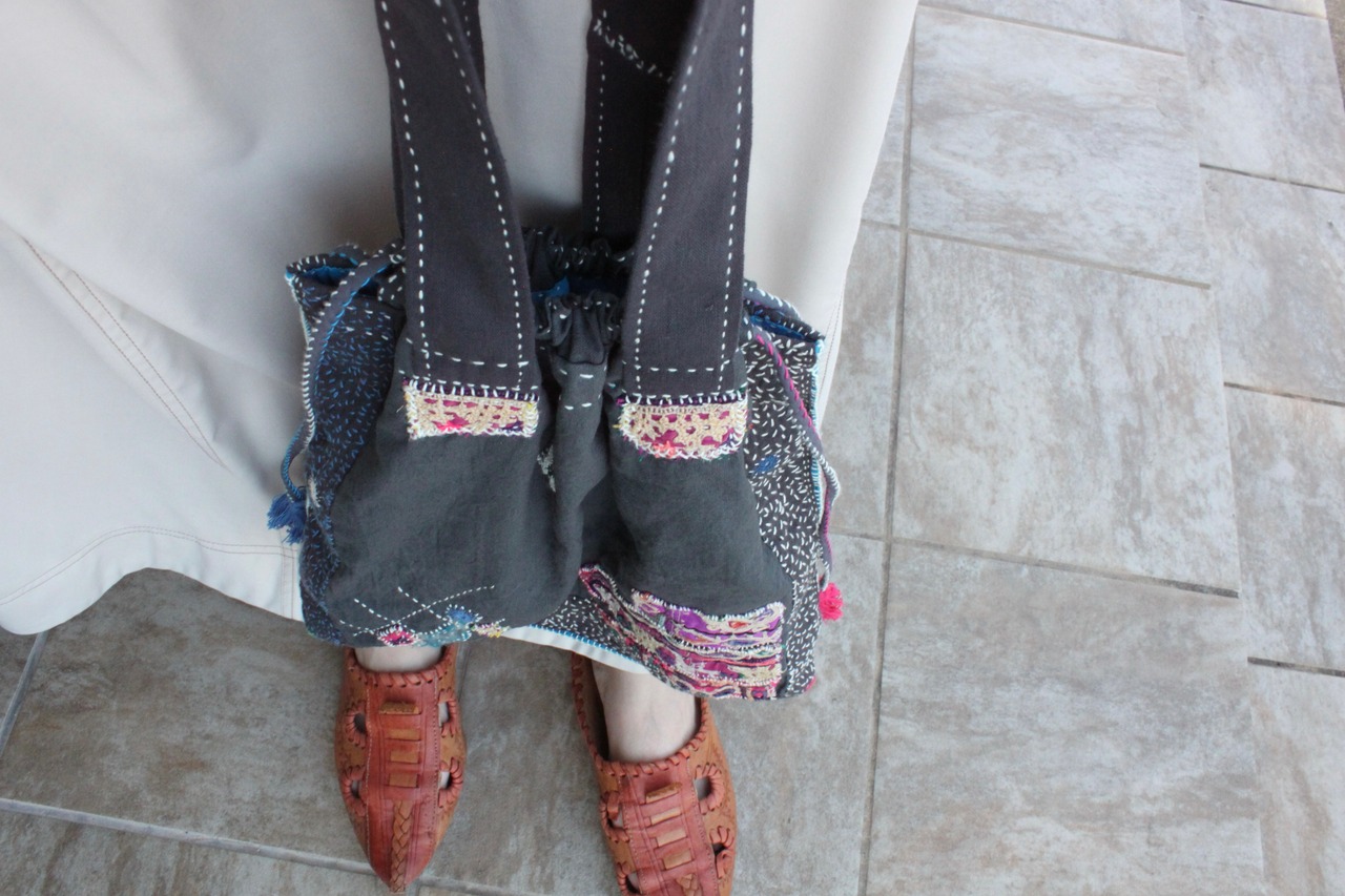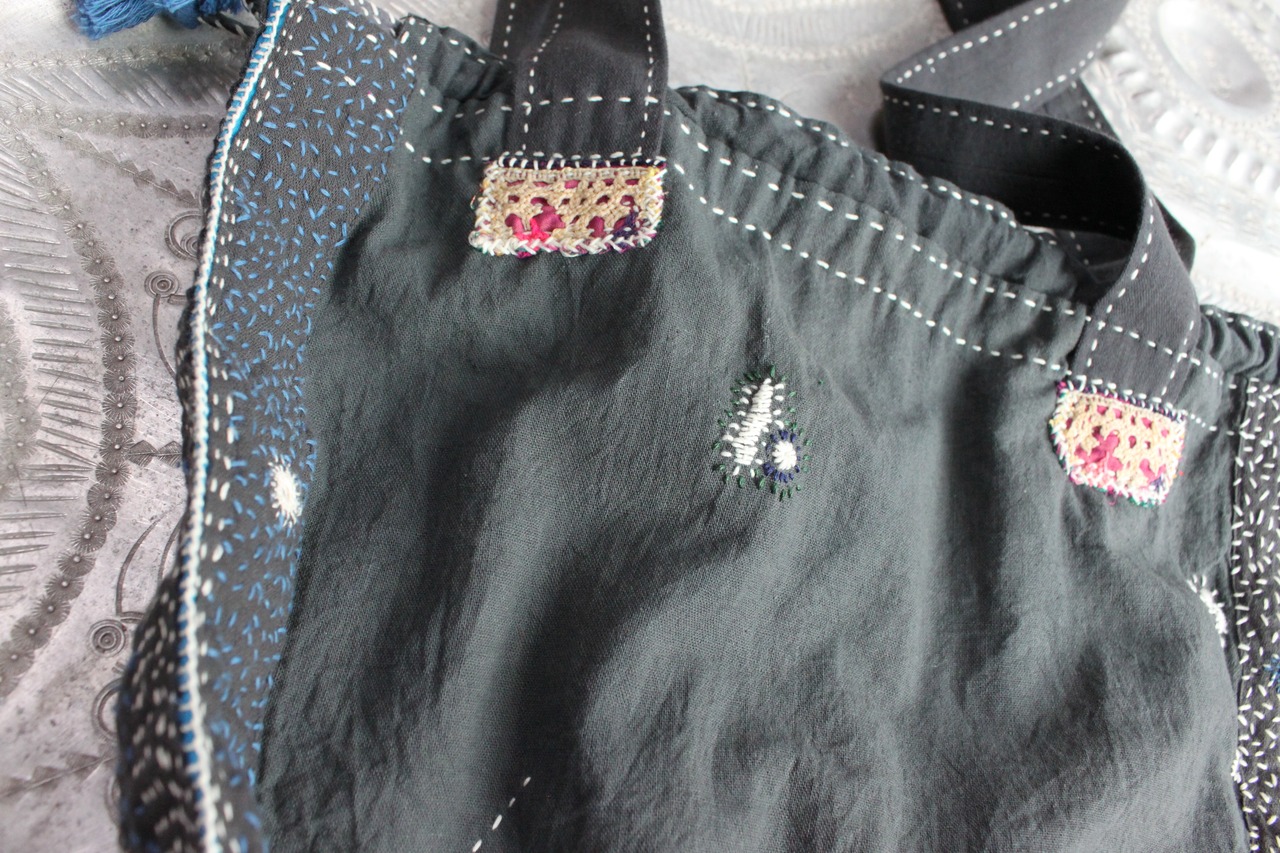 グレーの布をベースに刺し子やミラー刺繍をしたり、インドの少数民族 ラバリ族の刺繍布を組み合わせて作った巾着型のバッグです。