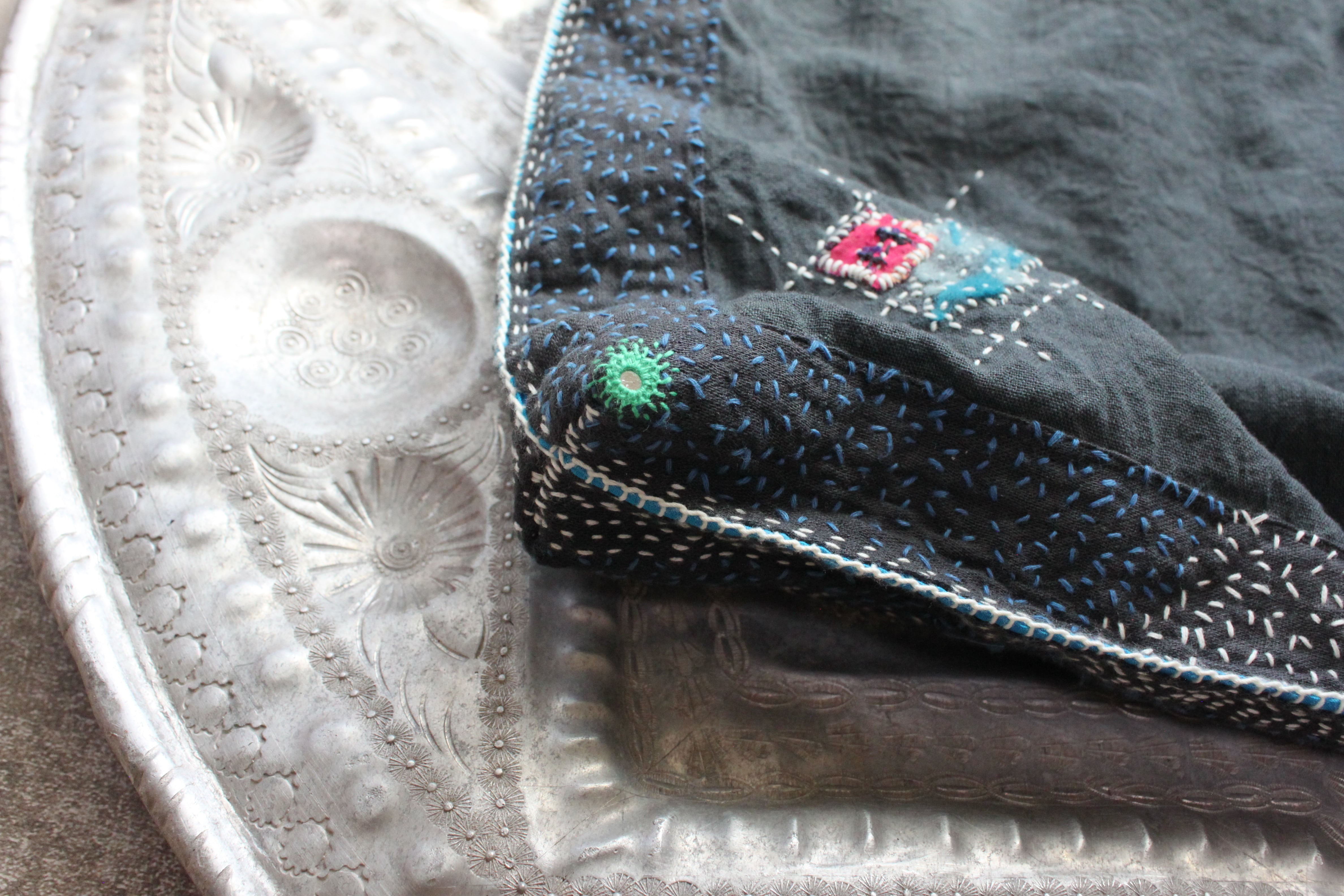 縫いつけている刺繍はインドの少数民族の古い刺繍生地を使用しています。