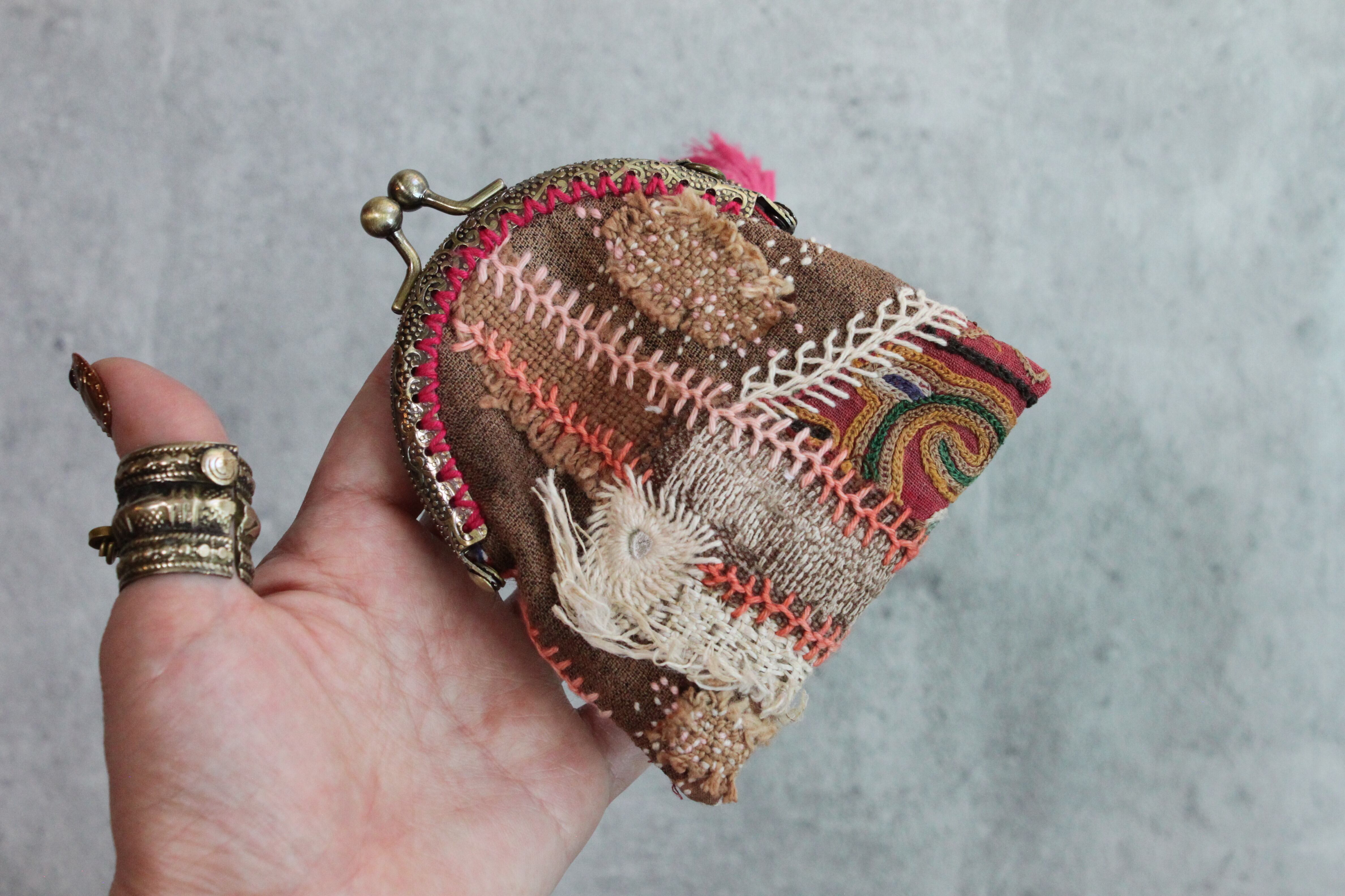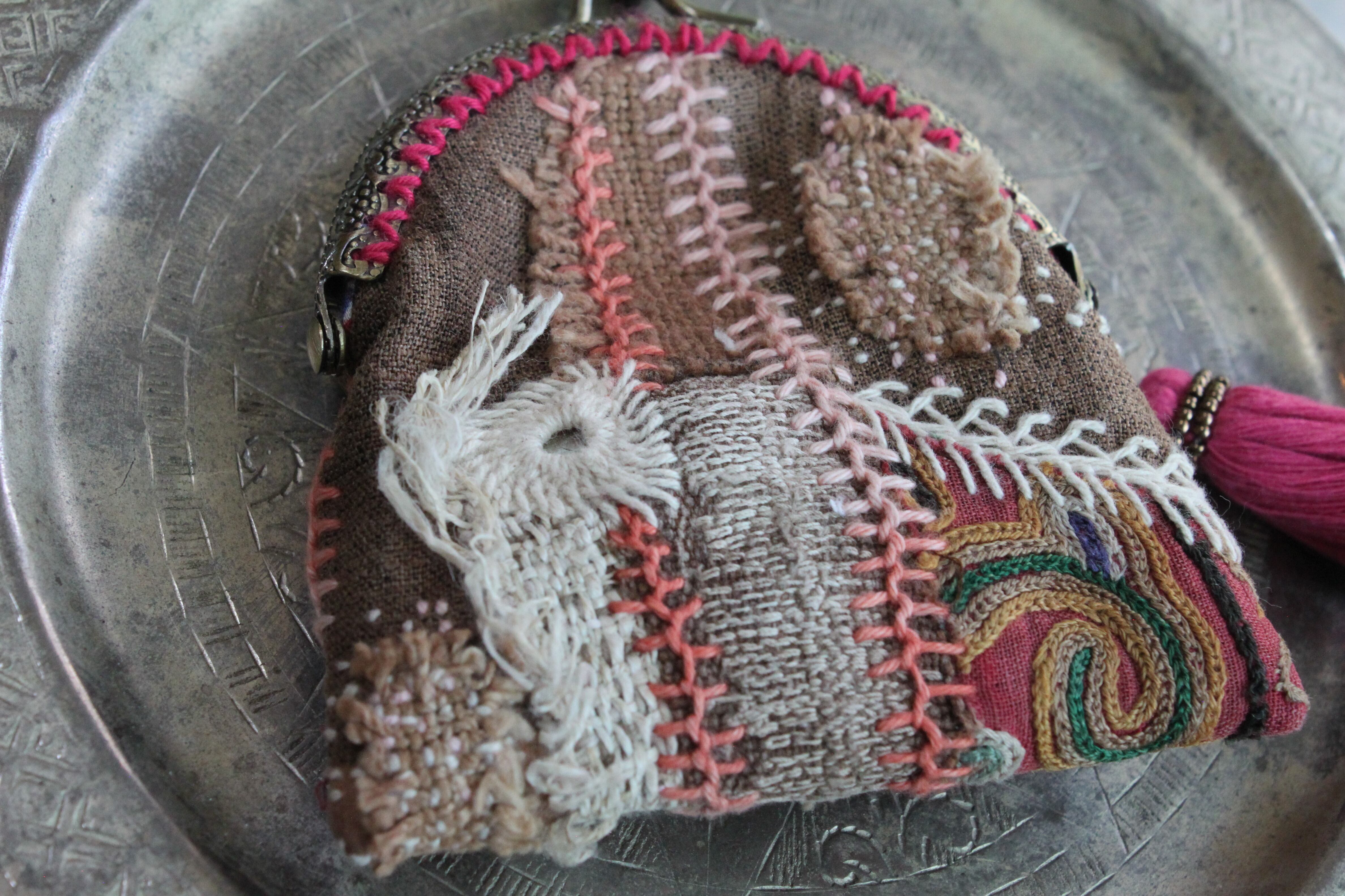 様々な風合いの柿渋染めの布とインドの刺繍生地を組み合わせた