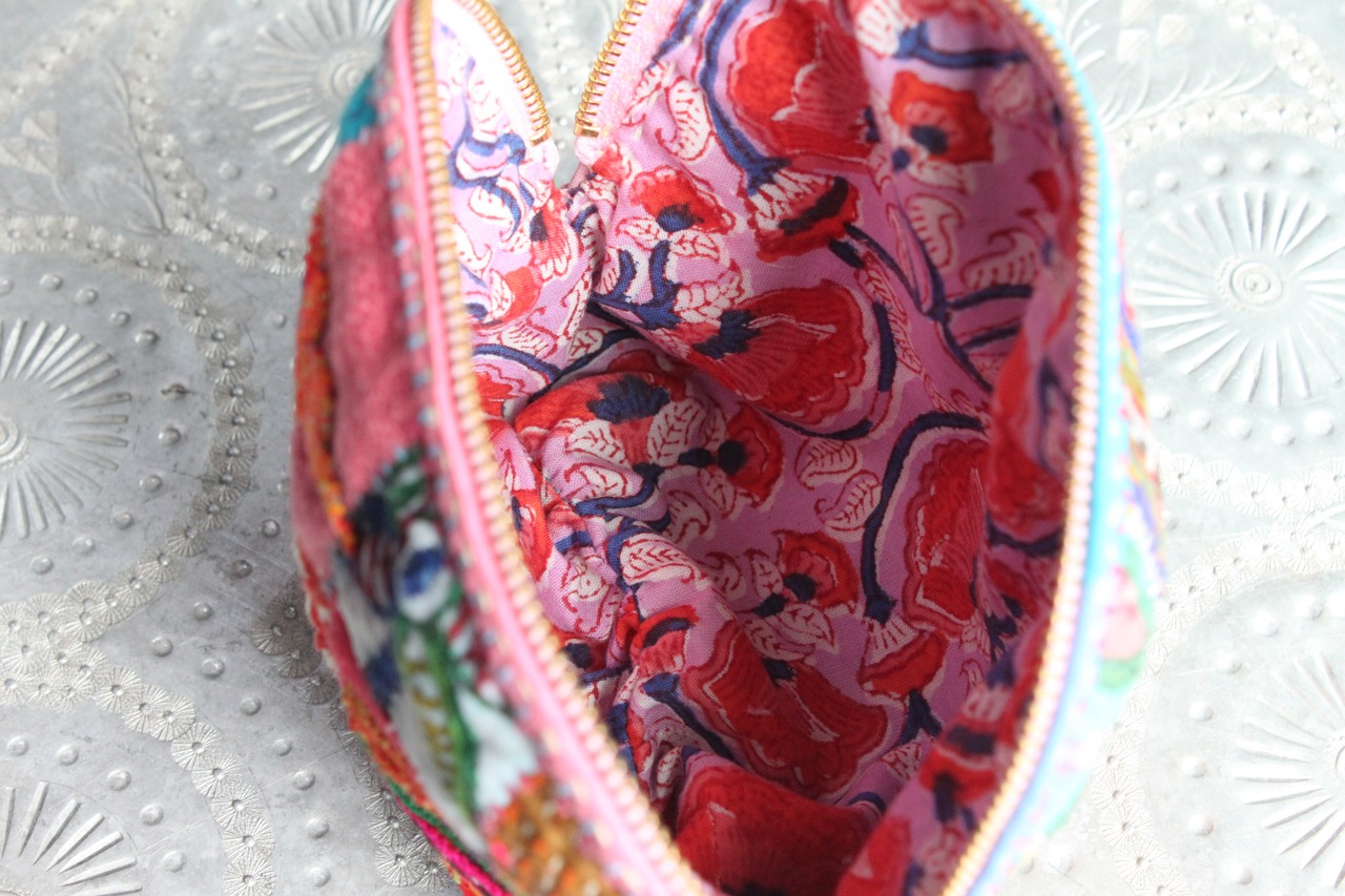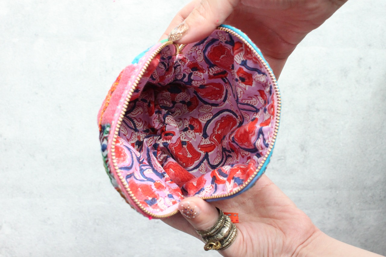 つなぎ合わせ、さらに刺繍を追加して仕上げたポーチです