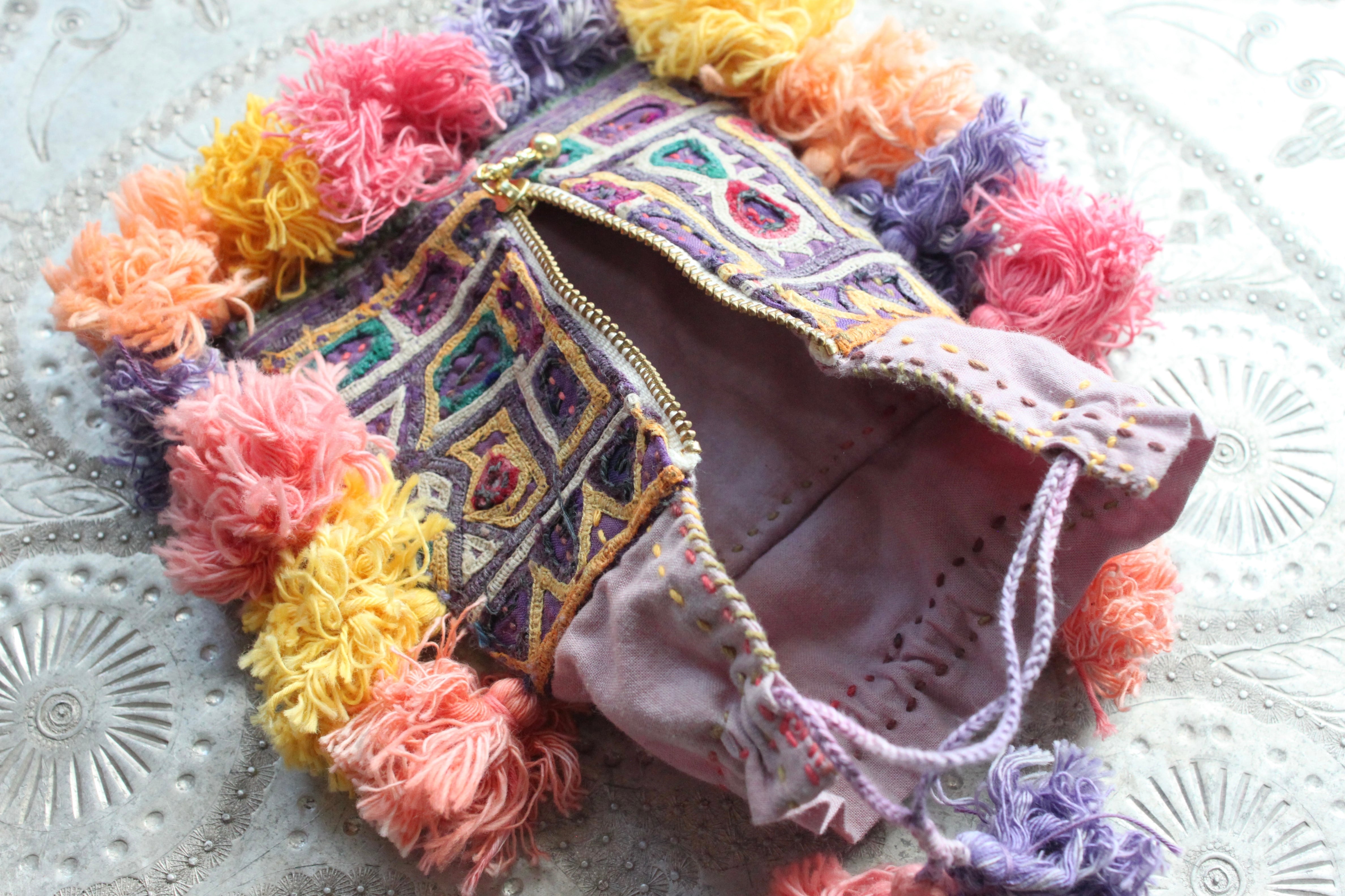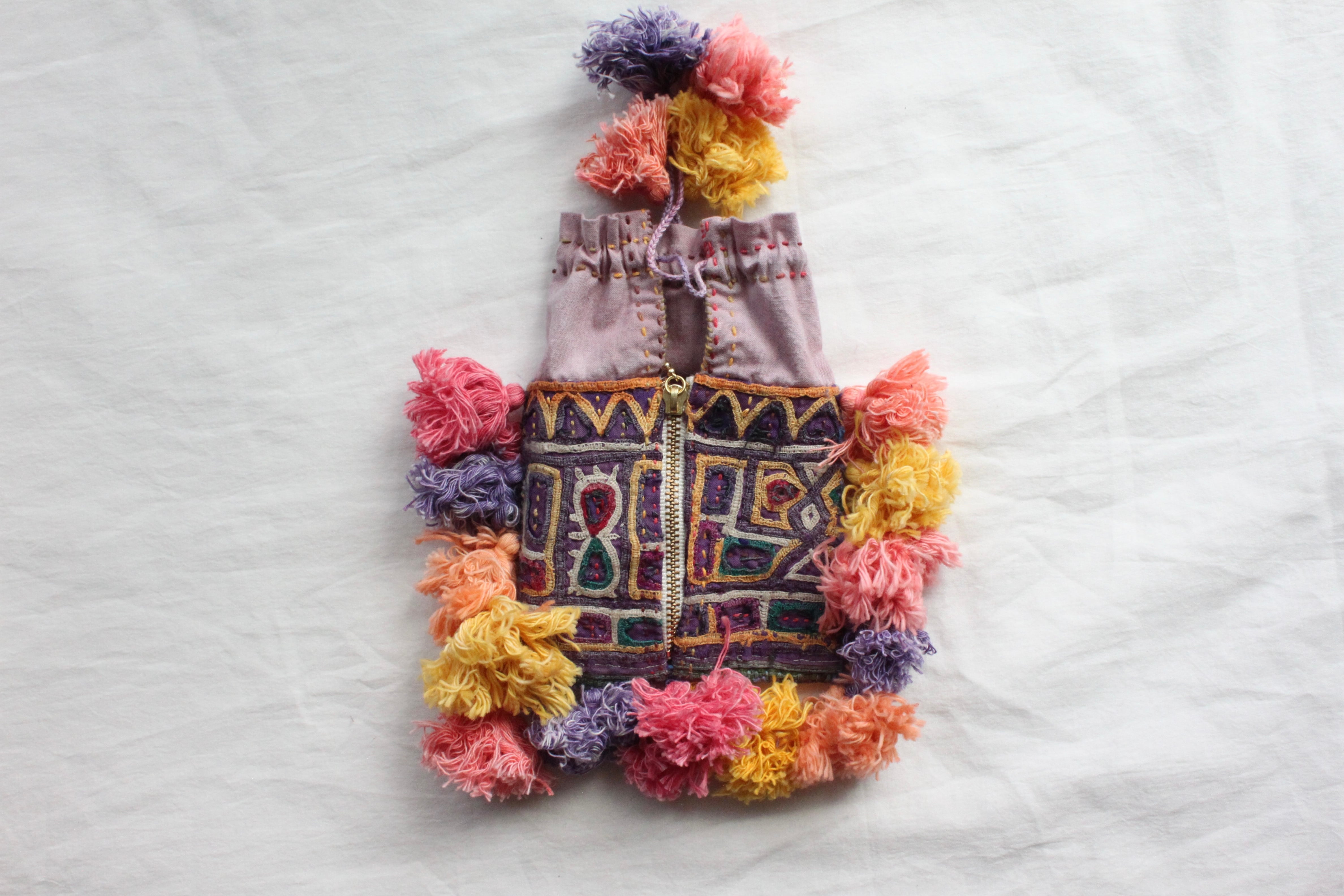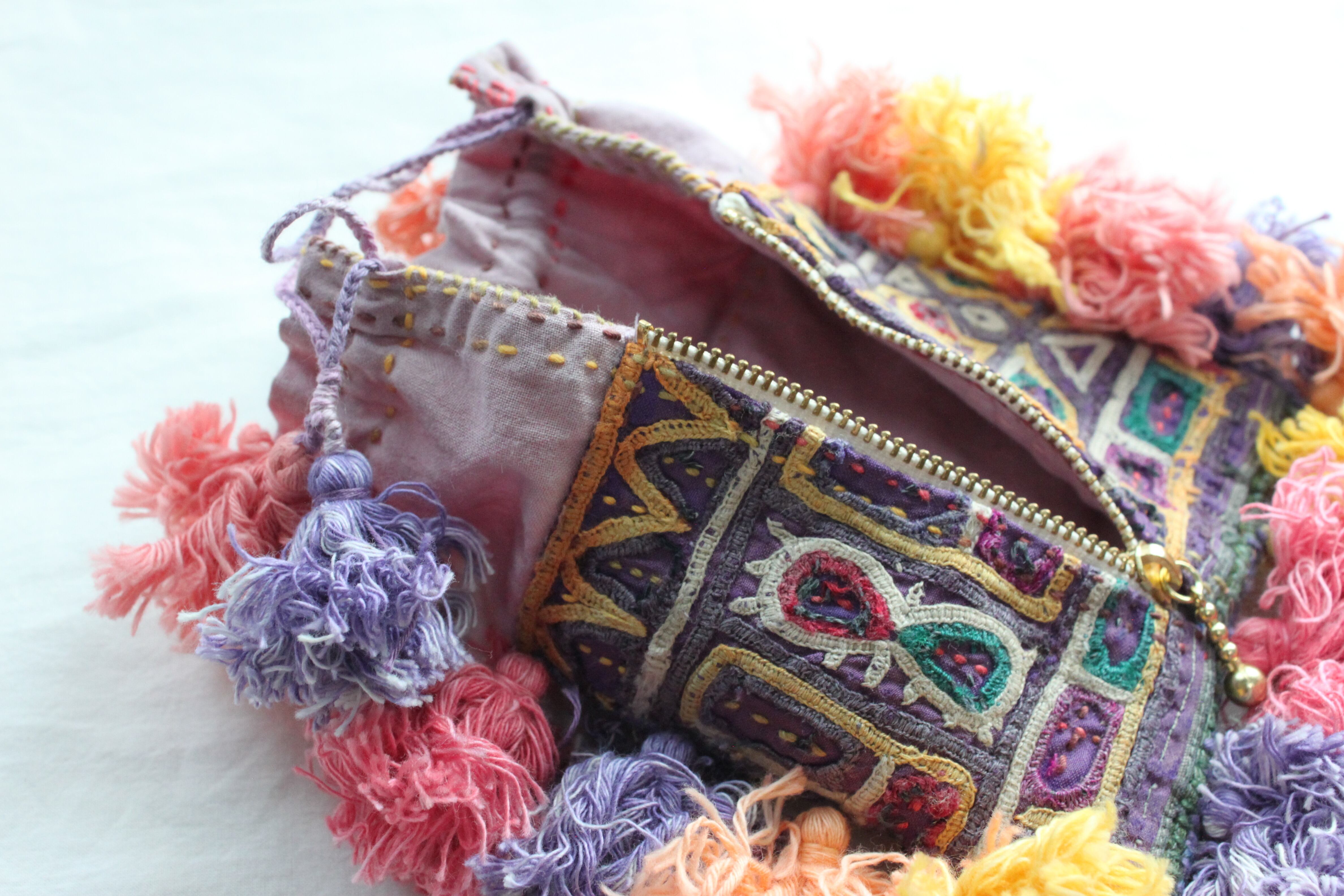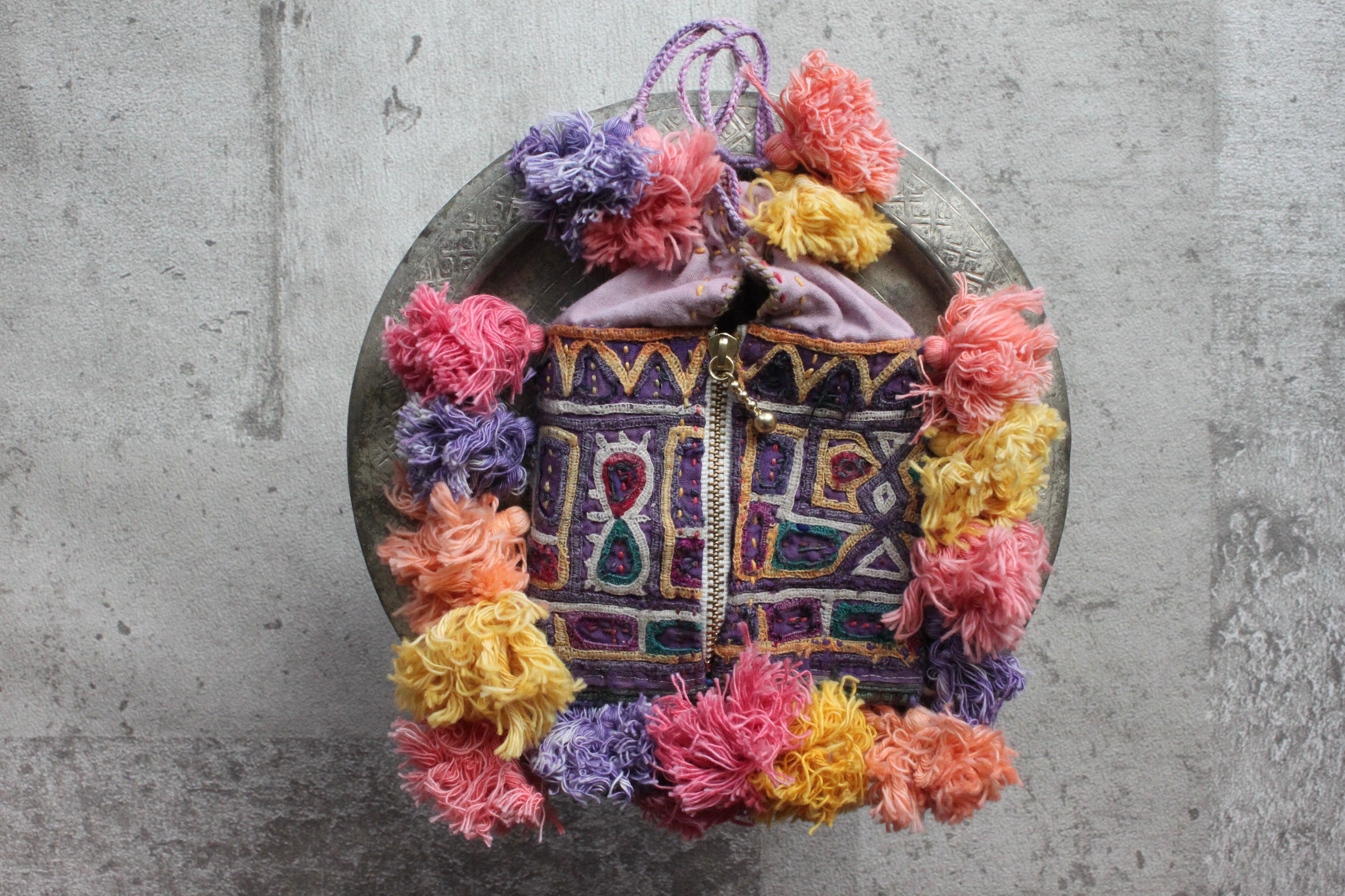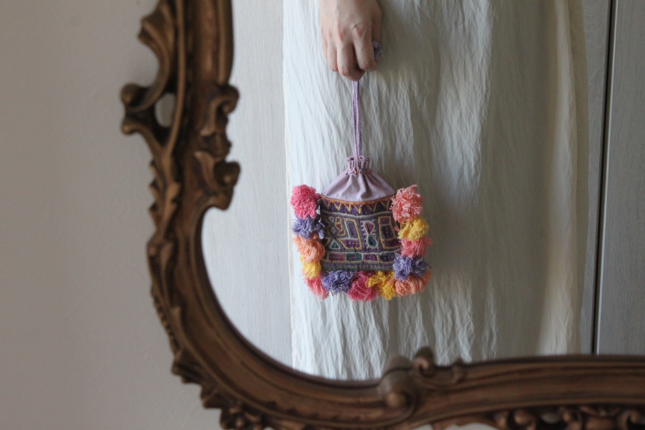 インド ラバリ族の手刺繍生地で作った巾着型ポーチ。