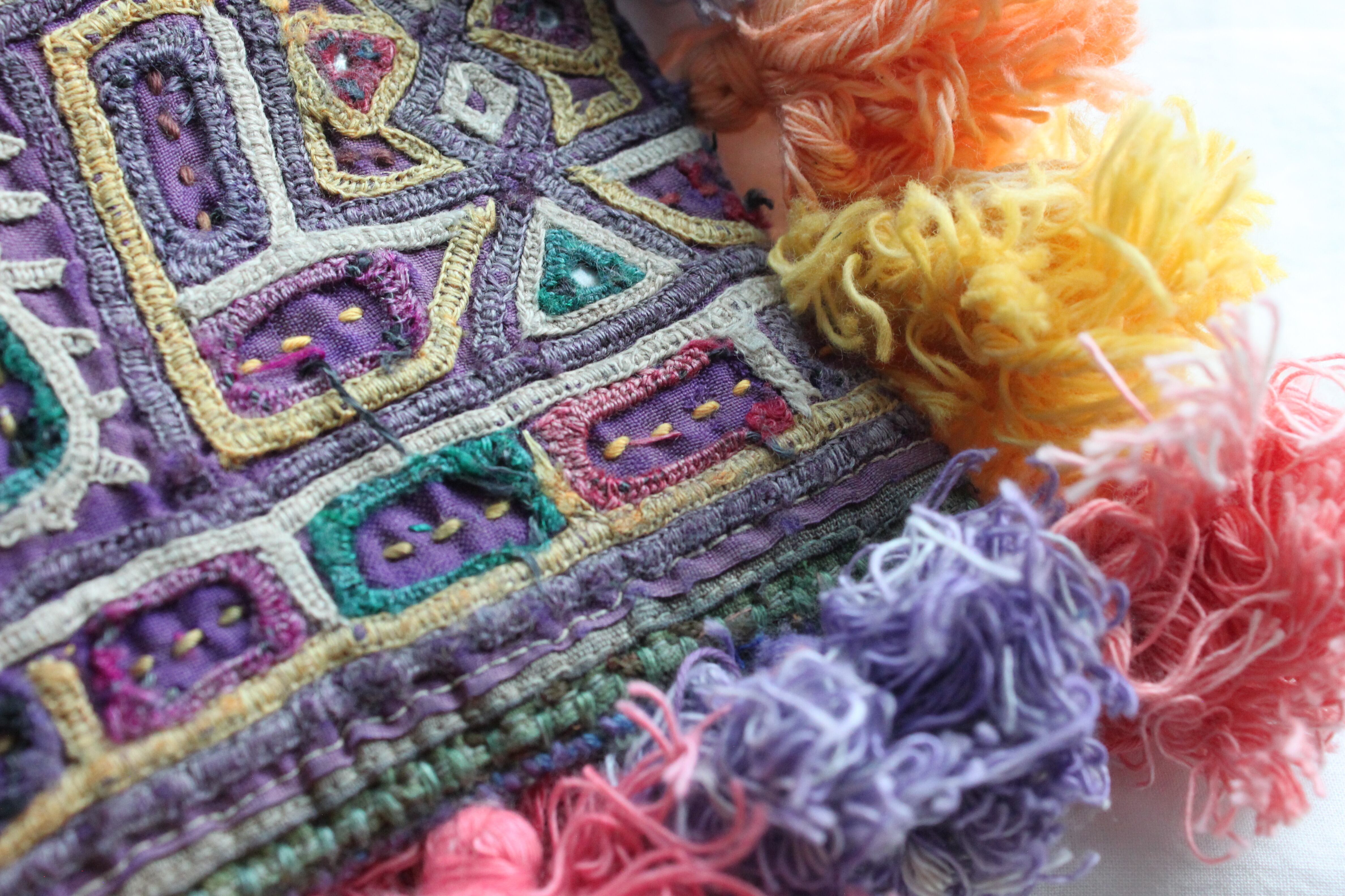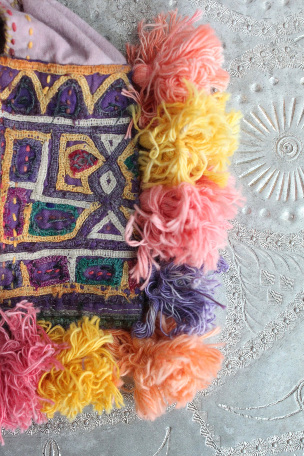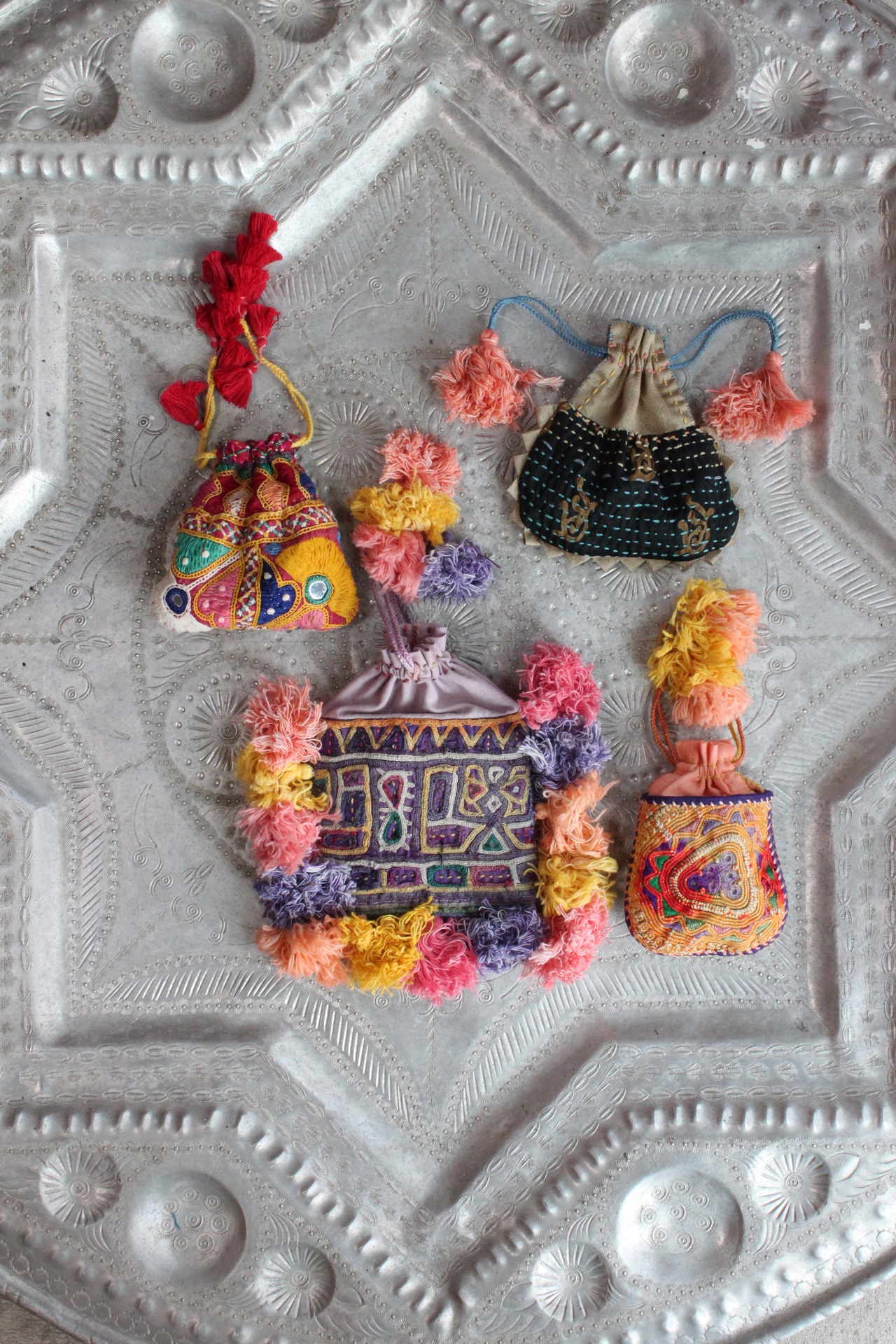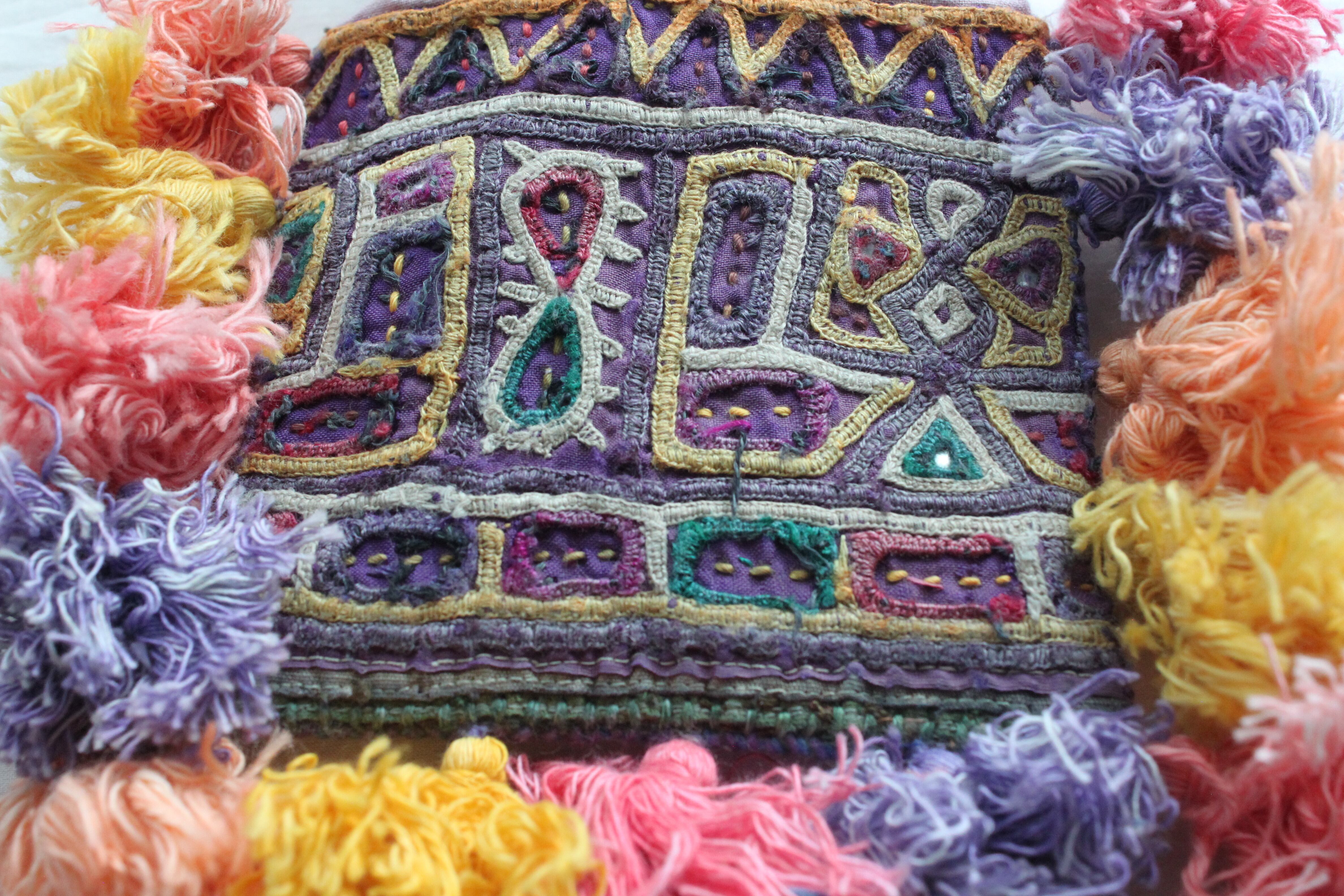 インド ラバリ族の手刺繍生地で作った巾着型ポーチ。