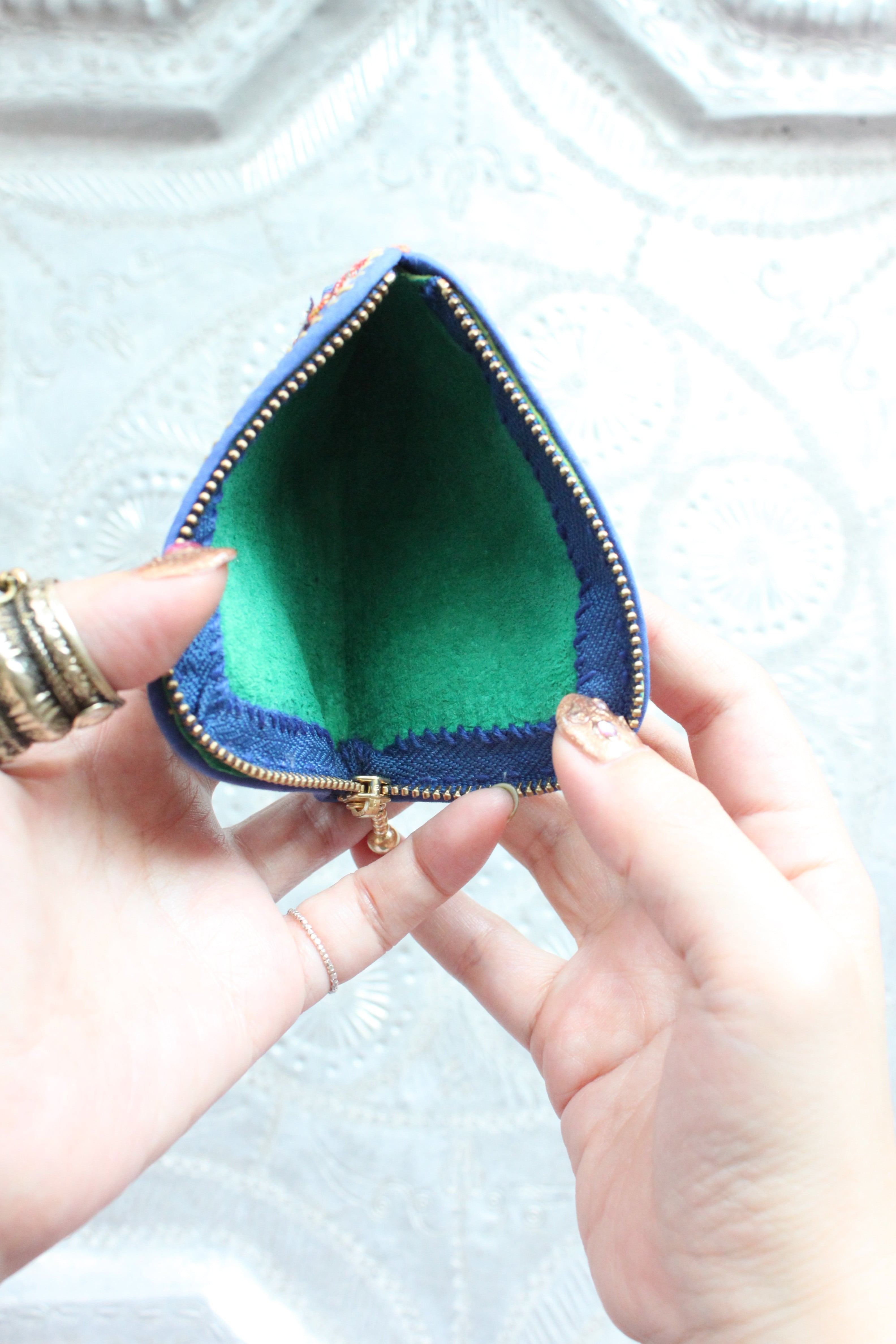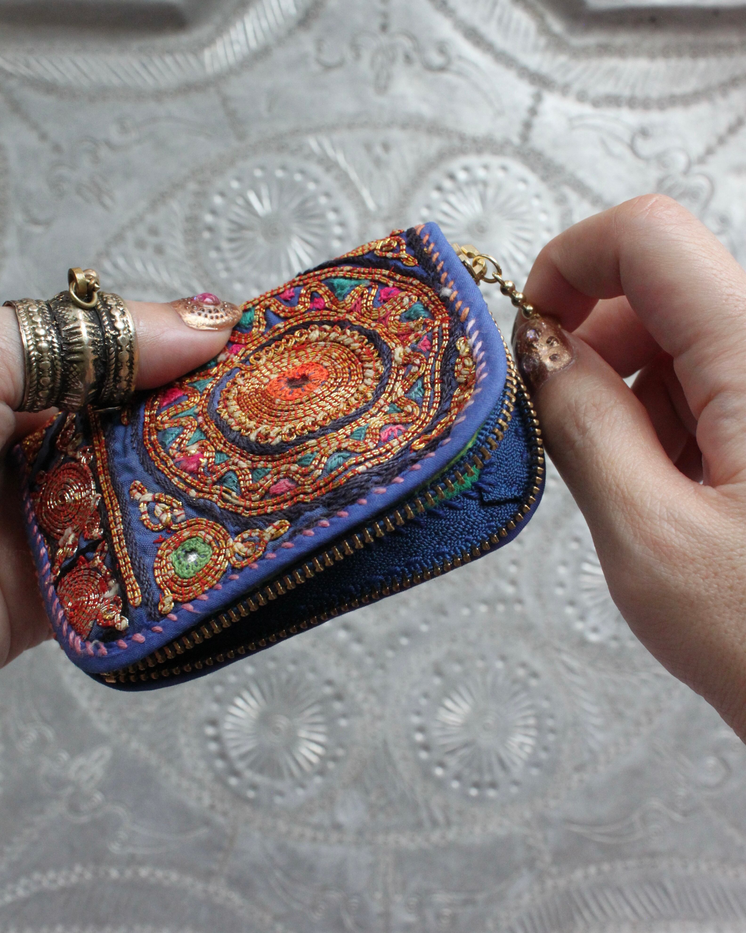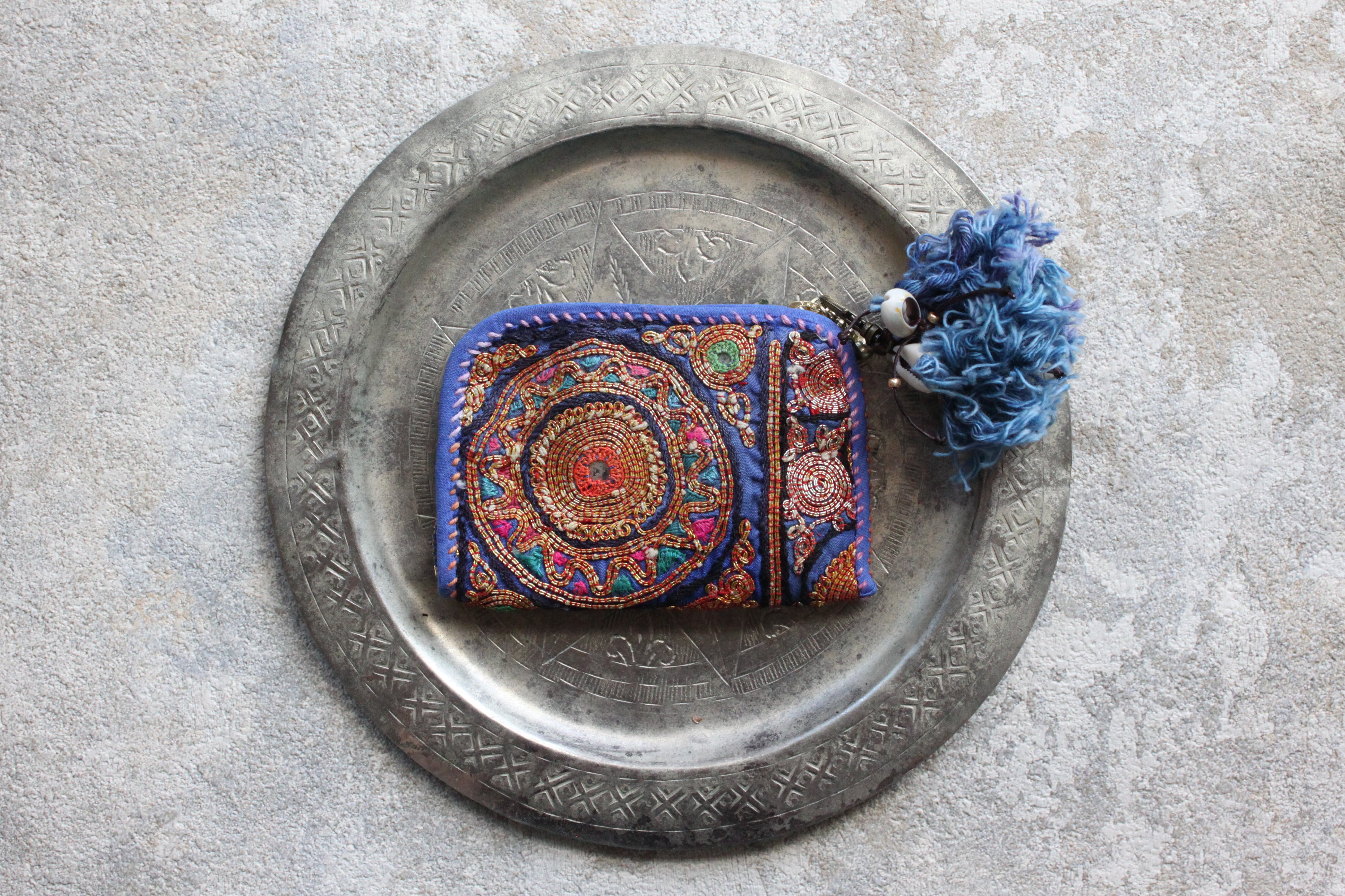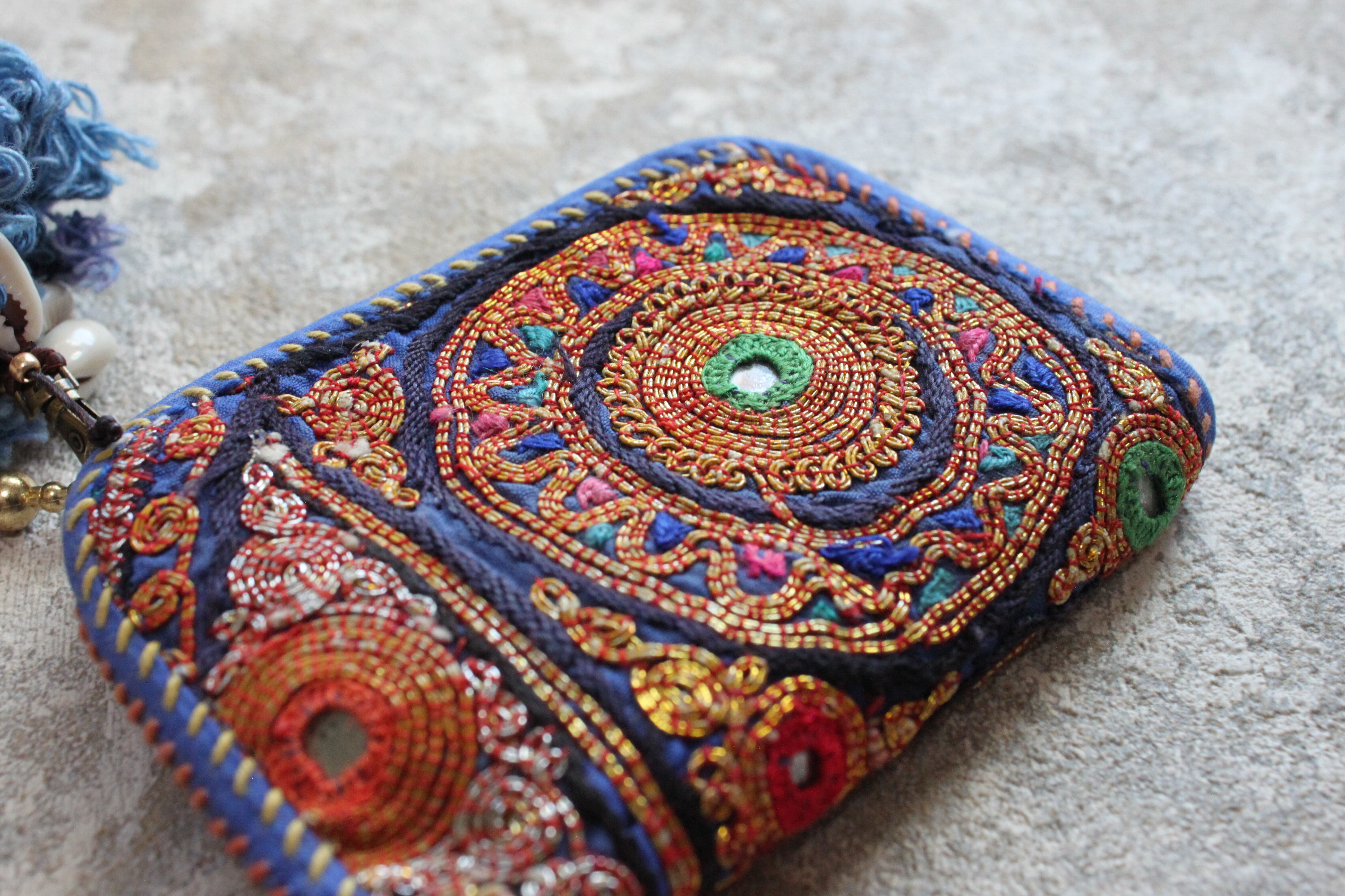 青色ベースにカラフルなミラー刺繍、三角デザインの刺繍がエキゾチックな雰囲気。