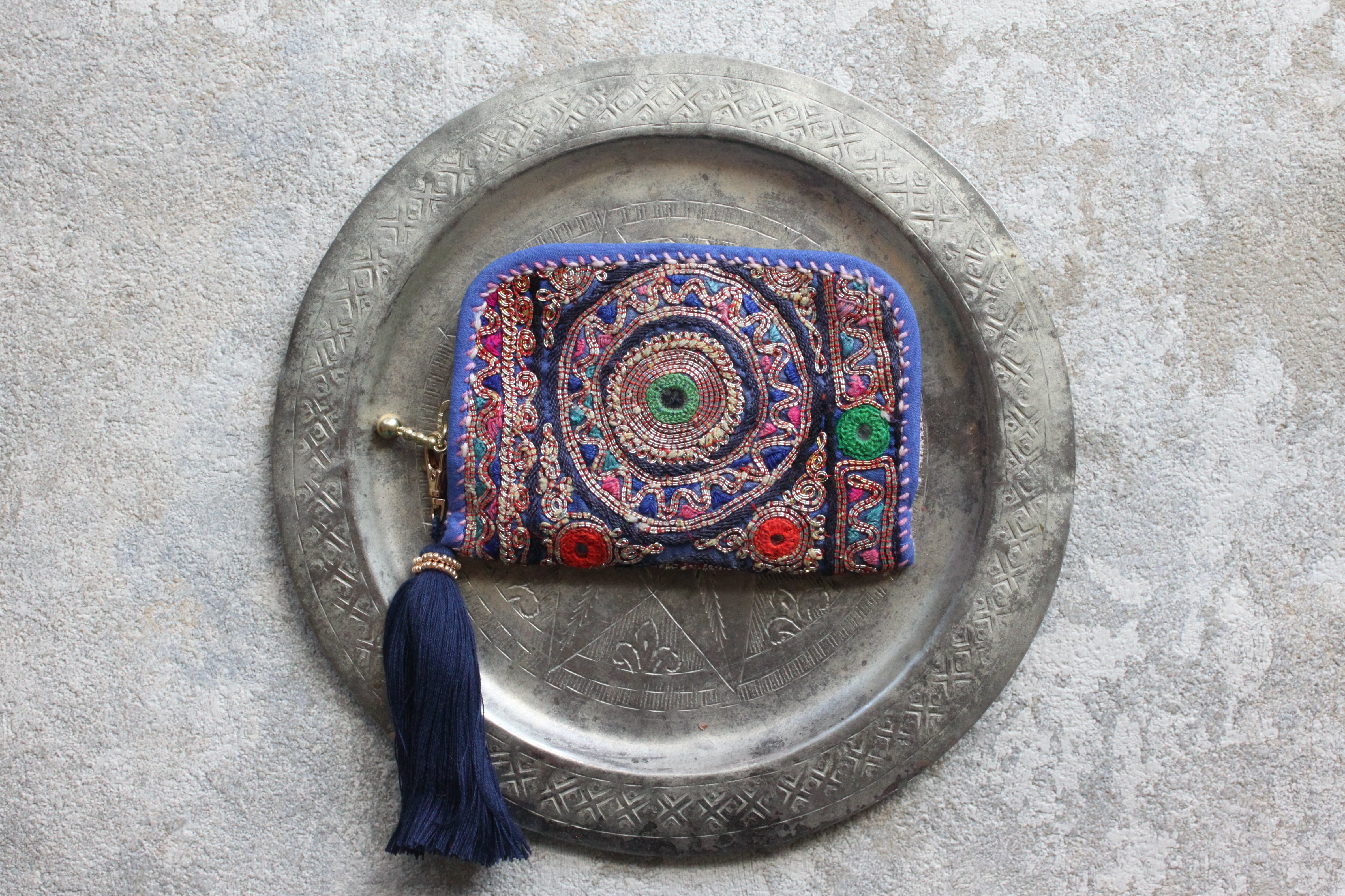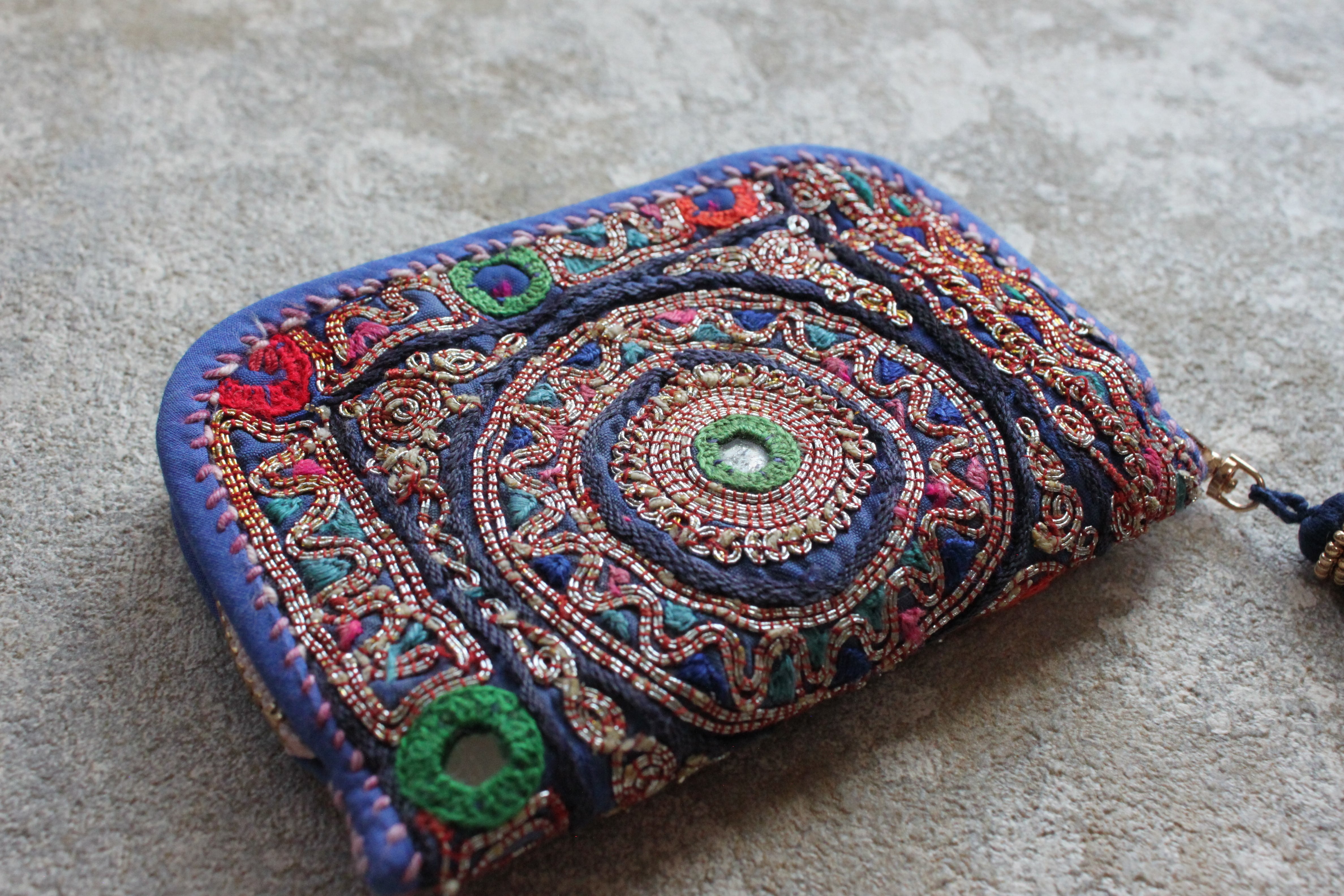 青色ベースにカラフルなミラー刺繍、三角デザインの刺繍がエキゾチックな雰囲気。